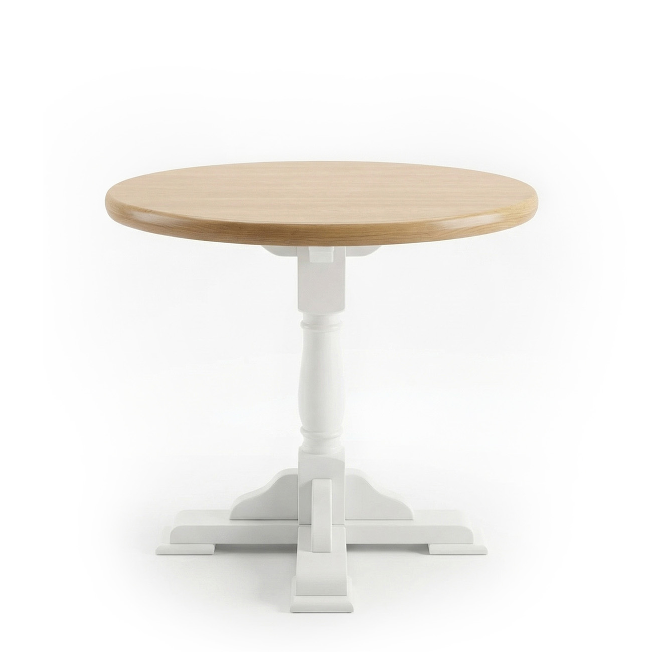 A dining table made of solid beech with an MDF veneered round top and a central pedestal foot. Two-color version, with the top and the base in different shades for a modern contrast. It is a table for 4 persons.